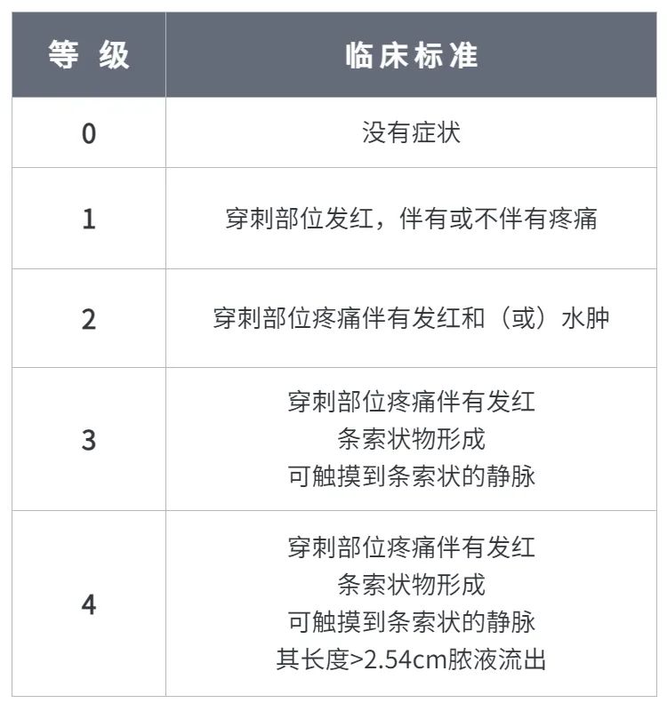當(dāng)患者穿刺部位及留置民管沿靜脈走行出現(xiàn)疼痛/觸痛、發(fā)紅、發(fā)熱、腫脹、硬結(jié)、膿性滲液或者可觸及條索狀靜脈,應(yīng)考慮靜脈炎[1,2]。進(jìn)行靜脈炎評(píng)估時(shí),推薦使用靜脈炎量表(見(jiàn)表1)因其具備良好的效度和信度,且在臨床上切實(shí)可行[3]。一旦確認(rèn)發(fā)生靜脈炎,應(yīng)根據(jù)患者情況及靜脈炎評(píng)估等級(jí),分析其發(fā)生原因,以采取合適的干預(yù)措施,鼓勵(lì)患者或照護(hù)人員報(bào)告血管穿刺部位疼痛或不適感[4]。