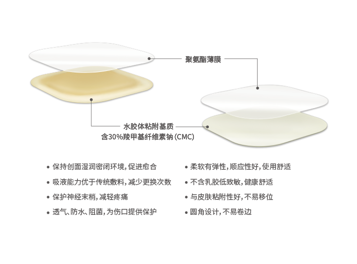 在局部形成密閉低氧環(huán)境,加速局部毛細(xì)血管增生,血流灌注增加,改善組織微循環(huán);刺激釋放巨噬細(xì)胞和白細(xì)胞介素,加速局部炎癥物質(zhì)、毒性物質(zhì)的代謝和吸收,從而消除紅腫,減輕疼痛。提供濕性的愈合環(huán)境,促進(jìn)組織修復(fù),上皮爬行。