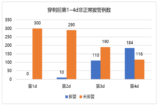 姚秀娥等學(xué)者研究發(fā)現(xiàn)[2],300例在上肢前臂穿刺的外周靜脈留置針置管患者,第1~4 d貼膜卷邊發(fā)生率及非正常拔管發(fā)生率分別為3.3%、30.0%、49.8%、83.3%及 0、3.3%、36.7%、61.3%(發(fā)生例數(shù)見圖1、圖2)。